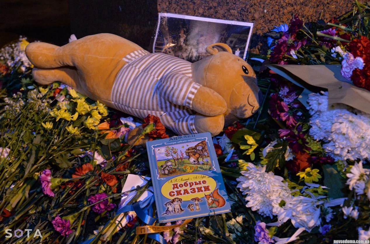 - Меморіал пам'яті жертв ракетного обстрілу в Дніпрі біля пам'ятника Тарасу Шевченку в Петербурзі – ndash; весь у квітах та іграшках. Поліції поряд немає (Джерело: SOTA)