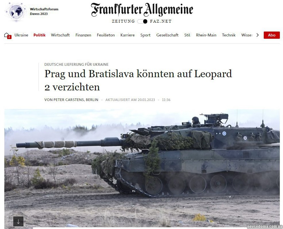 - Словаччина та Чехія готові передати Україні свої танки Leopard 2. Країни готові відмовитись на користь України від танків Leopard 2A4, які призначалися ним від Німеччини в рамках компенсації за поставлені раніше радянські танки. Всього це близько 30 "Леопардів".