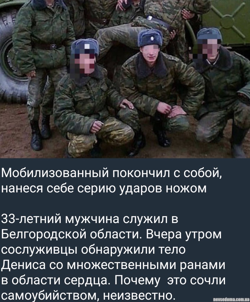 У росЗМІ пишуть, що 33-річний мобілізований, який служив у Білгородській області, наклав на себе руки, завдавши серію ударів ножем.