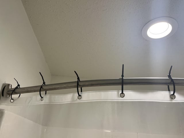Коли я переїхав до своєї квартири, я був надто зламаний і лінивий, щоб купувати кільця для душової шторки, тому я уявляю вам своє рішення.