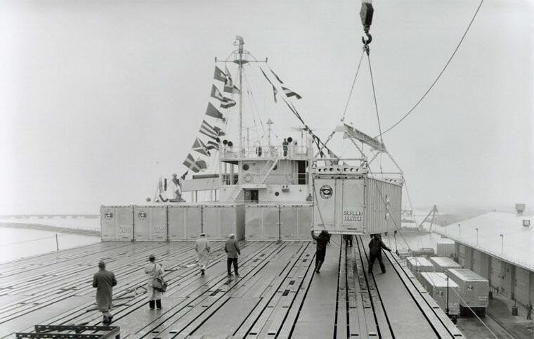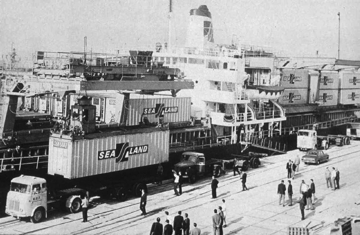 26 квітня 1956 року кран підняв п'ятдесят вісім алюмінієвих. кузовів на борт старого танкера, пришвартованого у Ньюарку (Нью Джерсі).