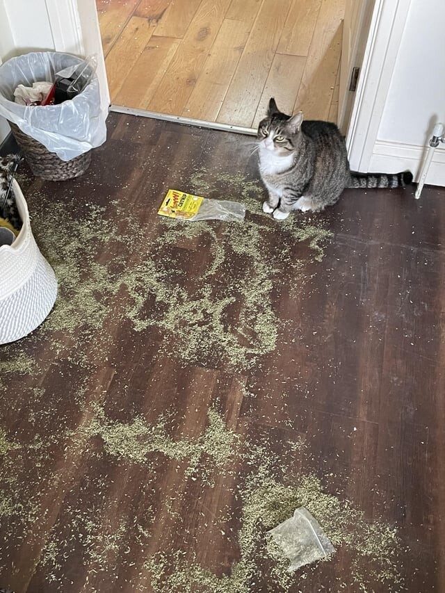 Він із задоволенням спостерігає за тим, як я прибираю його блювоту