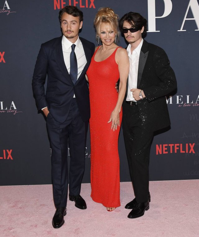 Легендарна актриса та рятівниця Малібу вирішила зробити відсилання до свого червоного купальника і з'явилася на прем'єрі фільму Памела. Історія кохання" в яскравій сукні. Супроводжували її діти від шлюбу з Томмі Лі.