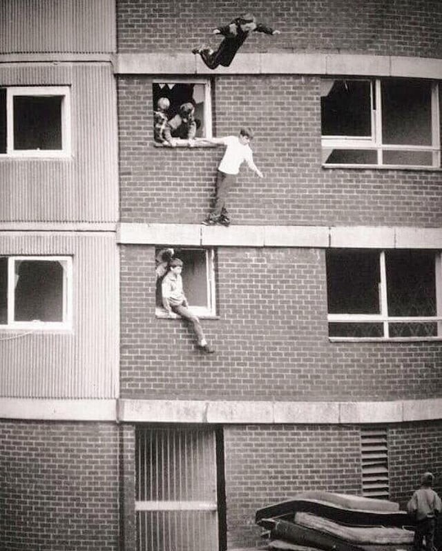 Діти стрибають на старих матрацах, Англія, вісімдесяті