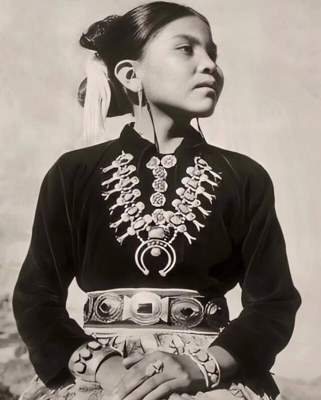 Дівчина з племені навахо у срібних та бірюзових прикрасах, 1950 рік