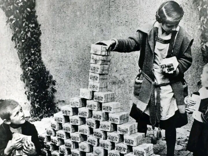 Діти грають пачками грошей, що знецінилися через війну, Веймарська Республіка (Німеччина), 1923 рік
