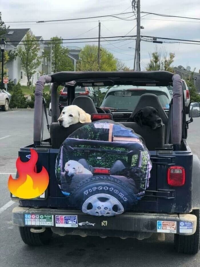 7. Досить нетипова поза для собак, які їдуть у машині. Але, судячи з фотографії на запасному колесі, це їхнє улюблене становище тіла.