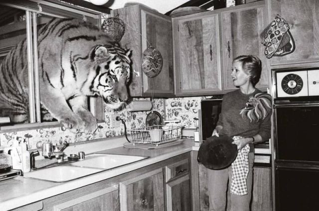 Актриса та активістка із захисту тварин Тіппі Xедрен і її тигр Грегорі в заповіднику Шамбала. 1981 рік.