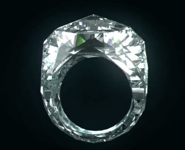 Це кільце є не лише одним із найдорожчих у світі, а й неймовірно дивовижним, тому що воно виконане із цільного діаманта. На його виробництво пішло багато сил і часу, так як художники дизайнери зіткнулися з низкою труднощів при розробці креслень та схем майбутнього кільця.