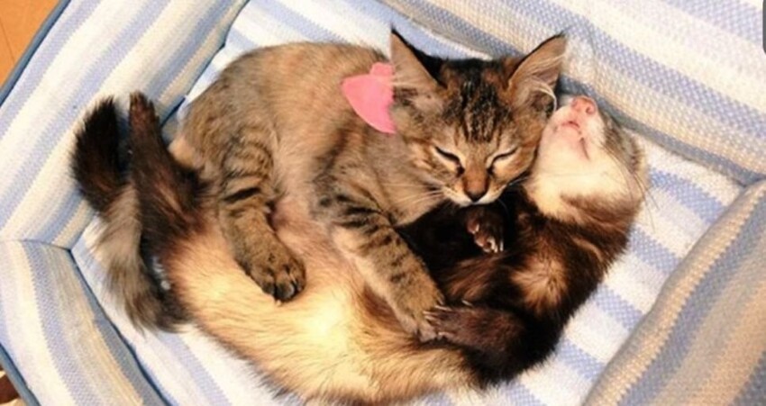 Проте побоювання були марними. Як тільки котик потрапив у товариство тхорів - вони одразу його прийняли до своєї пухнастої родини тхорів. Тепер — кошеня там як своє. Він одразу ліг серед теплих тхорів.