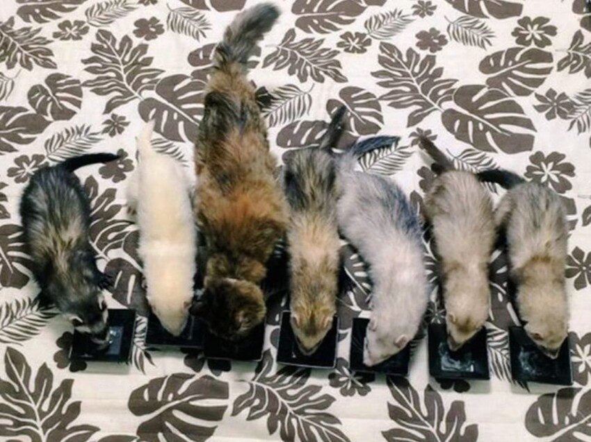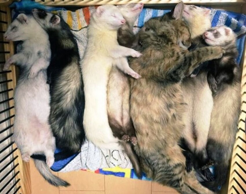 Разом з друзями (хорьками) кошеня прожило вже довгий час і разом вони виросли. Подивіться - як кошеня вже виросло, але продовжує спати разом із своїми пухнастими друзями — «хорьочками».