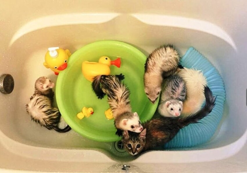 Чим вони тільки протягом дня не займаються: сплять, грають один з одним, їдять разом і відпочивають. А ще, всі ці вихованці дружно приймають водні процедури у ванній, разом із різними іграшки.