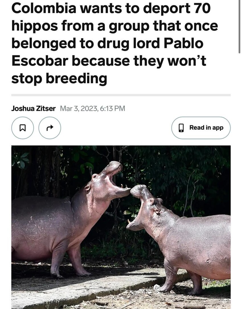 Історія появи бегемотів у Колумбії відома всім. Хто забув чи не в курсі, можна прочитати тут. Якщо в короткому змісті, то в 80-х роках наркобарон Пабло Ескобар заради забаганки ввіз до країни 4 бегемота. Наркобарон благополучно помер, частину бегемотів забрали місцеві зоопарки, а решта за 40 років розплодилася до 150 штук.