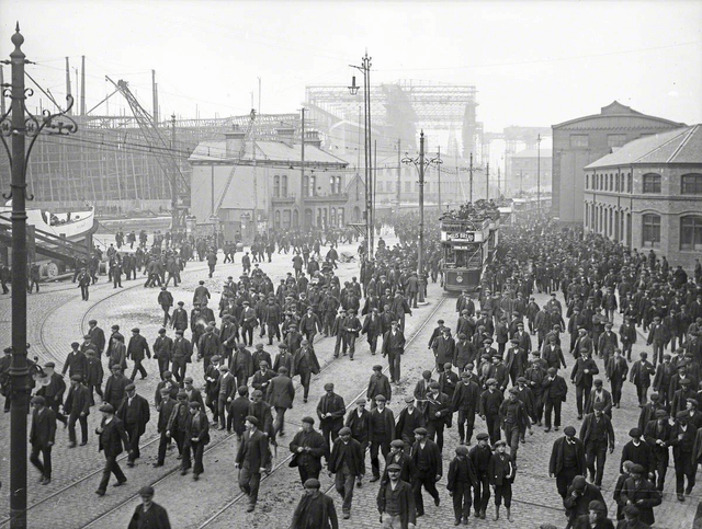 9. Тисячі робітників залишають верф після зміни. На задньому плані можна побачити "Титанік", що будується, 1911 рік