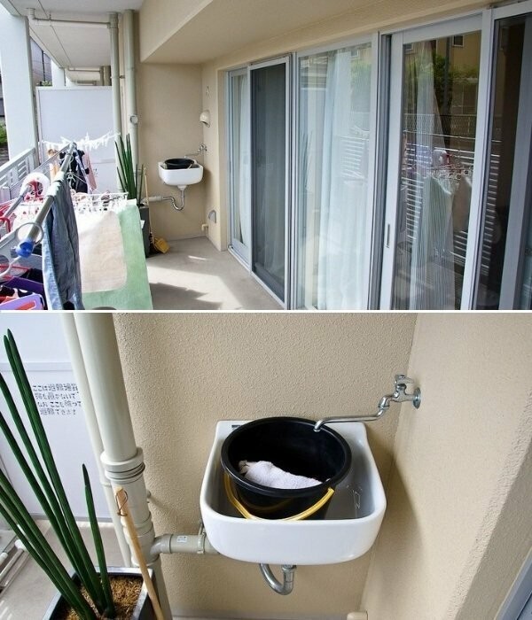 У нових будинках раковини в туалеті зовсім не може бути: тільки душ, де й передбачається мити посуд та руки. Втім, це не означає, що людей залишили без раковини: вона тут є, просто знаходяться вона на загальному балконі, який служить одночасно і місцем для сушіння речей, і невеликим складом, і верандою, де можна посидіти ввечері з чашкою чаю.