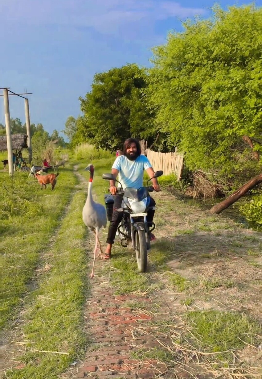 Містер Аріф опублікував у соціальних мережах кілька відеороликів зі своїм новим крилатим другом, на яких видно, як він їде на своєму мотоциклі, а вірний журавель із разюче червоною головою летить позаду нього.