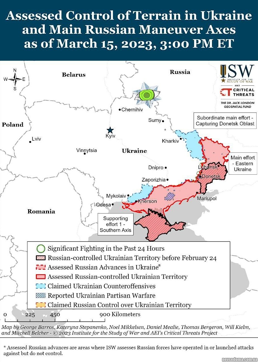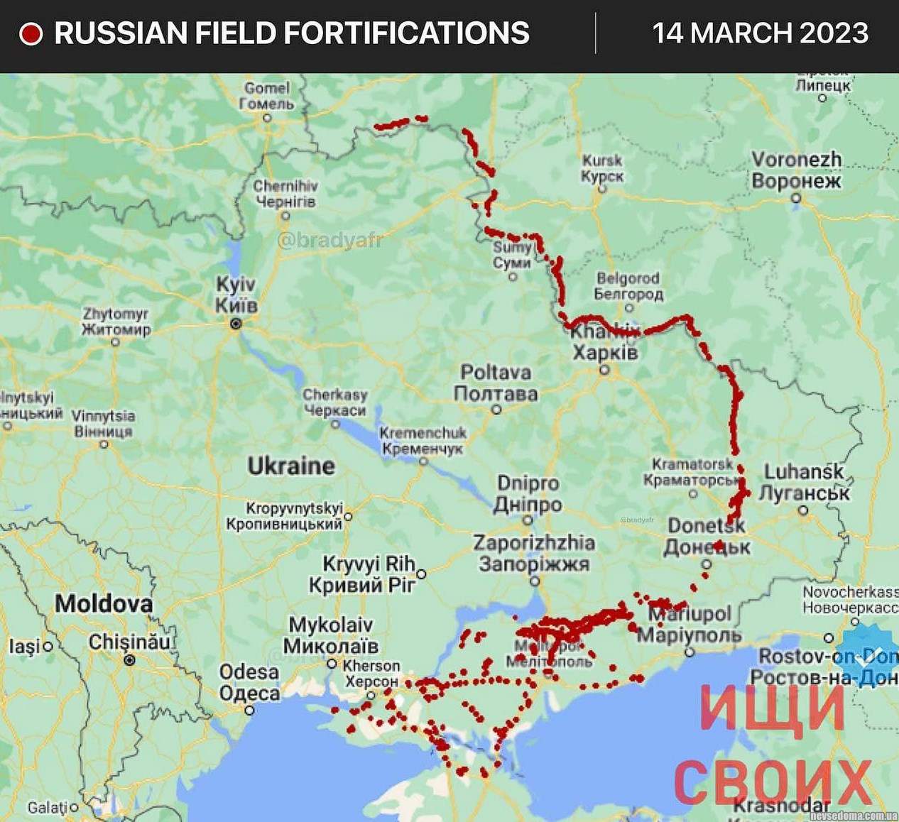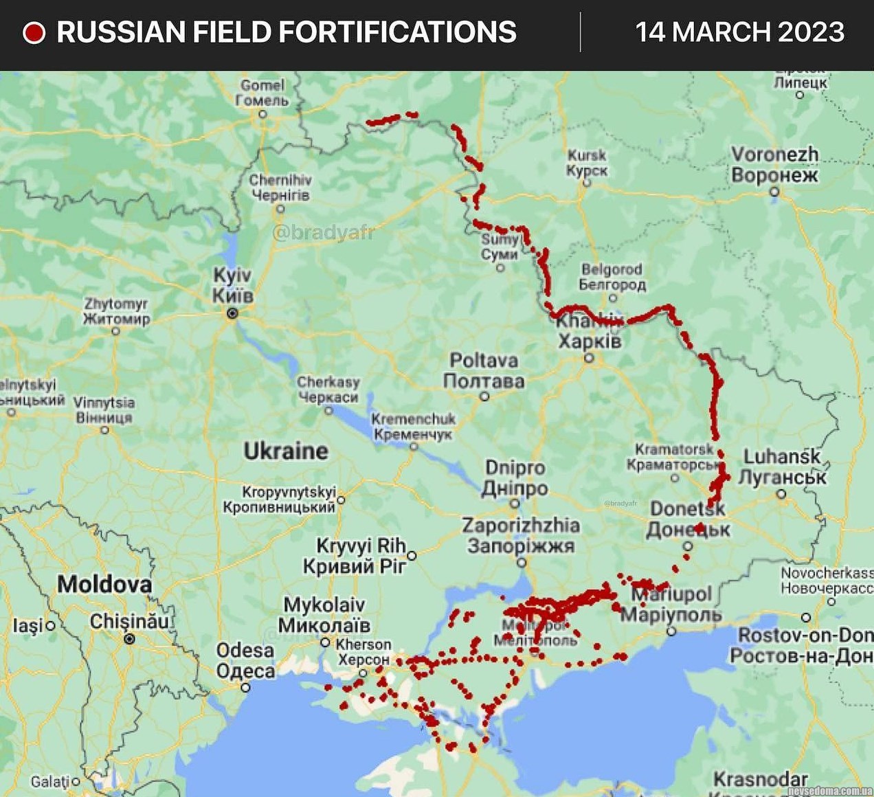 ▪️Аналіз супутникових знімків (https://twitter.com/bradyafr/status/1635725244852838400?cxt=HHwWgIC9mbPcobMtAAAA) свідчить про будівництво РФ різних укріплень навколо захопленої території України та кордонів з нею