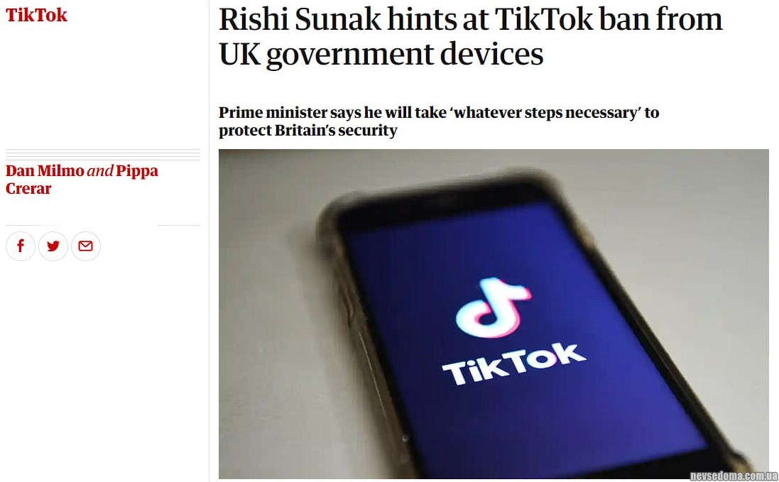 - У Великій Британії можуть заборонити TikTok чиновниками через зв'язки програми з Китаєм, — прем'єр-міністр Великобританії Ріші Сунак.