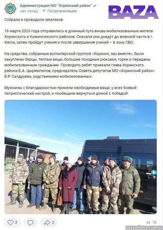 - 16 березня 2023 року вирушили на війну знову мобілізовані жителі Бурятії. В адміністрації «Базі» відповіли, що «мобілізація звичайна, вона не завершувалася — завжди була, є і буде, ніхто її не скасовував.