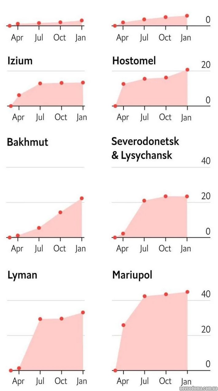 - Ступінь зруйнованості українських міст учас російського повномасштабного вторгнення за даними The Economist. Маріуполь посів перше місце