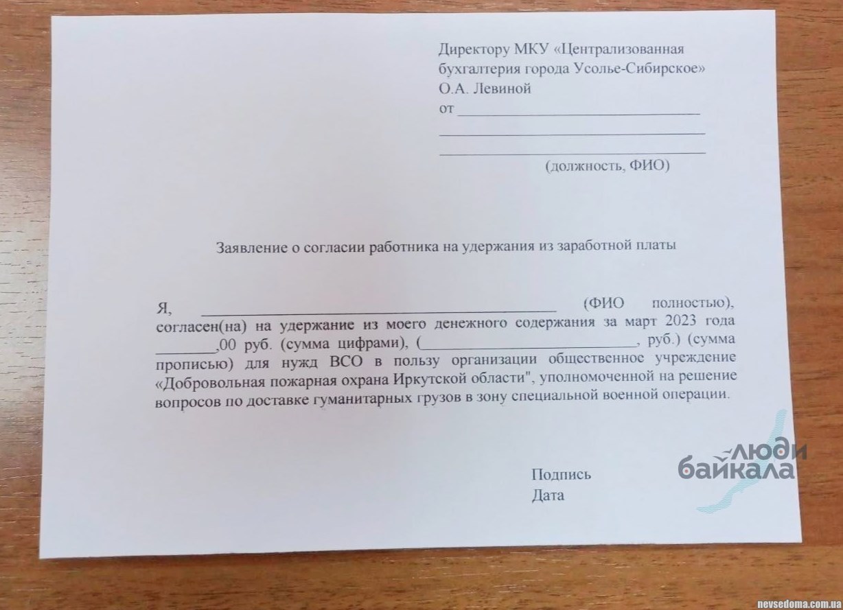 - «Команда дана мінімум на 200 рублів». В Іркутській області запровадили збори з бюджетників на підтримку війни. Бланк заяви журналістам надіслала педагог однієї зі шкіл міста Усольє-Сибірський. За її словами, такі бланки отримали інші бюджетники.