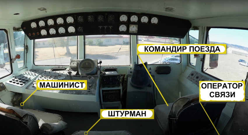 Попереду сидів командир поїзда. Він в основному дивився в радар, щоб випадково не пропустити ворожу ракету. Зліва попереду місце машиніста. Він працював за пультом і крутив ручку потенціометра, регулюючи потужність та швидкість. За маршрутом та картами стежив штурман. А тримав зв'язок із командним центром оператор зв'язку.