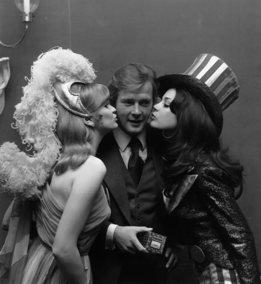 Роджер Мур (Бонд) з Міс Великобританія та Міс США, Мерілін Енн Уорд та Брюсін Сміт, 1971 рік