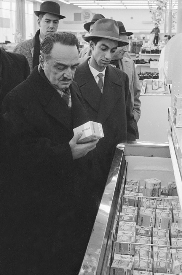 Анастас Мікоян із радянською делегацією розглядає ванільне морозиво у холодильнику. Візит до США, січень 1959