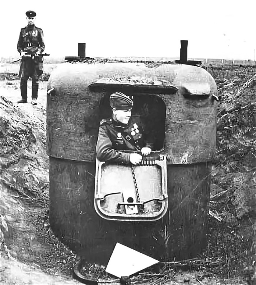 Боєць Червоної Армії у німецькій броньованій вогневій точці Panzernest. У Червоній Армії називалася "Краб". 1945 рік