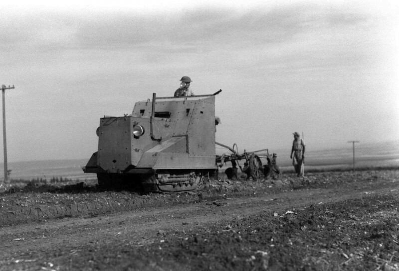 Броньований трактор орає поле в кібуці Мішмар-ха-Емек, недалеко від Мегіддо, під час арабського повстання. Підмандатна Палестина. 1938 рік