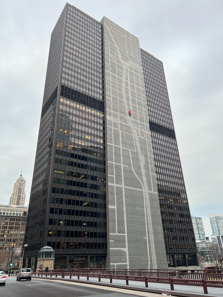 На хмарочосі зображено карту Чикаго, яка показує, де ви зараз знаходитесь