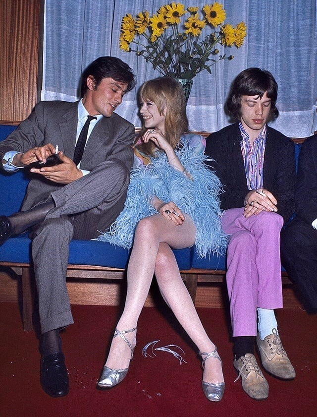 6. Ален Делон весело спілкується з Маріанною Фейтфулл, дівчиною Міка Джаггера, а той сумно сидить поряд, 1968 рік