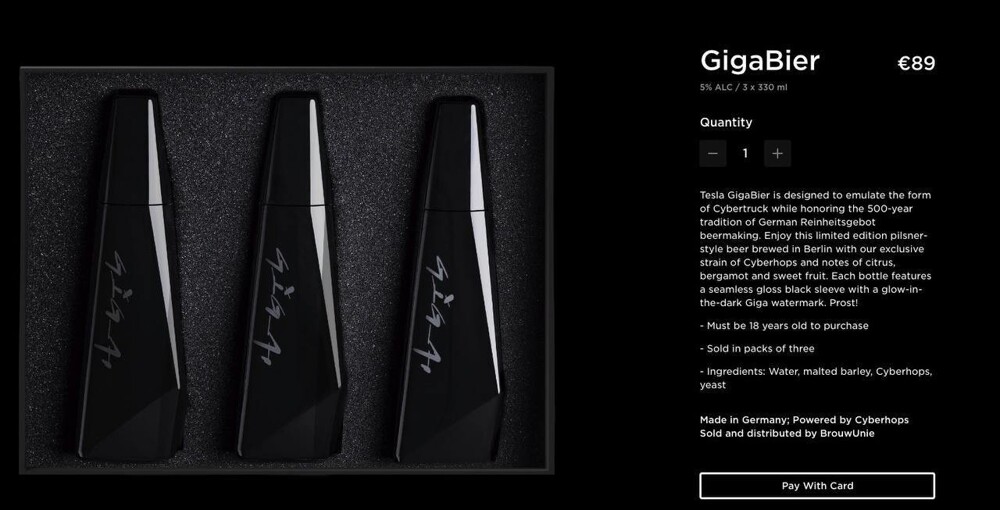 Фірмовий напій GigaBier у вигляді електропікапа Cybertruck буде проводитись обмеженим тиражем і за захмарною Ціні: набір з трьох пляшок коштуватиме приблизно 100 доларів. Таку ціну задули, ймовірно, через бренд Tesla, та й варити хмільний напій з нотами бергамоту, цитрусу та солодких фруктів будуть у Берліні.