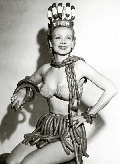 На фото переможниця конкурсу – актриса Джин Кортні. Сам конкурс проходив під час Національного тижня хот-догів та спонсорувався Zion Meat Company.