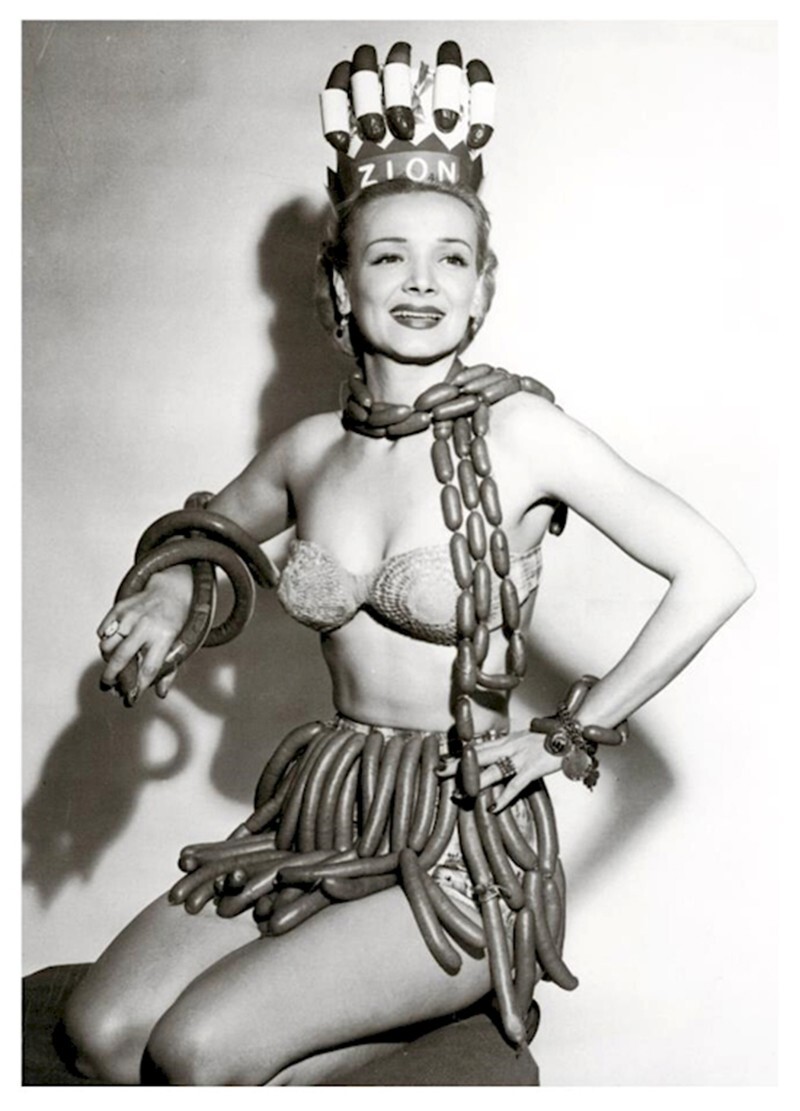 На фото переможниця конкурсу – актриса Джин Кортні. Сам конкурс проходив під час Національного тижня хот-догів та спонсорувався Zion Meat Company.