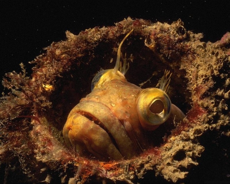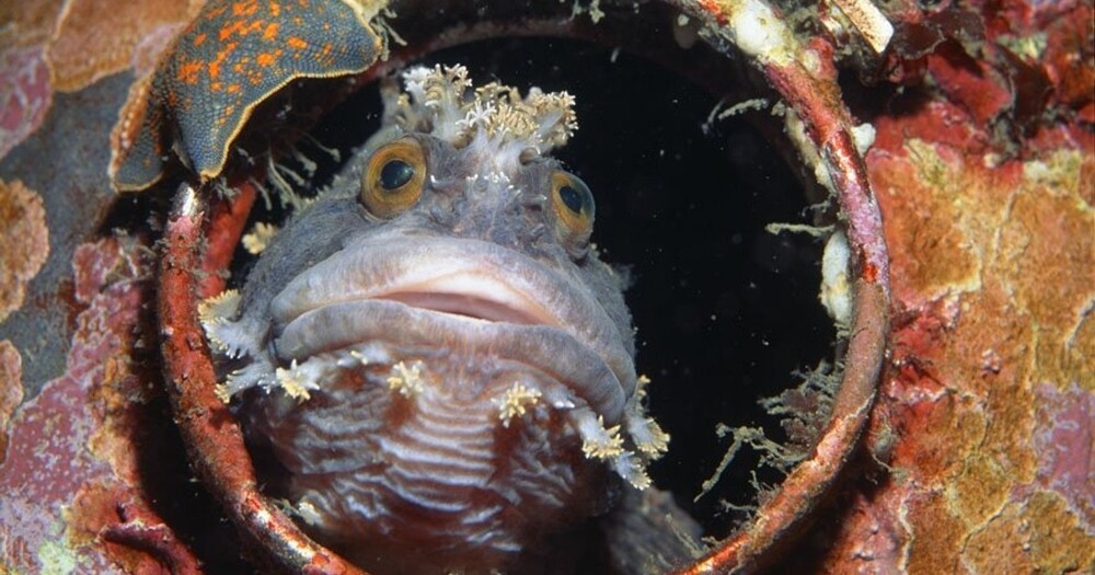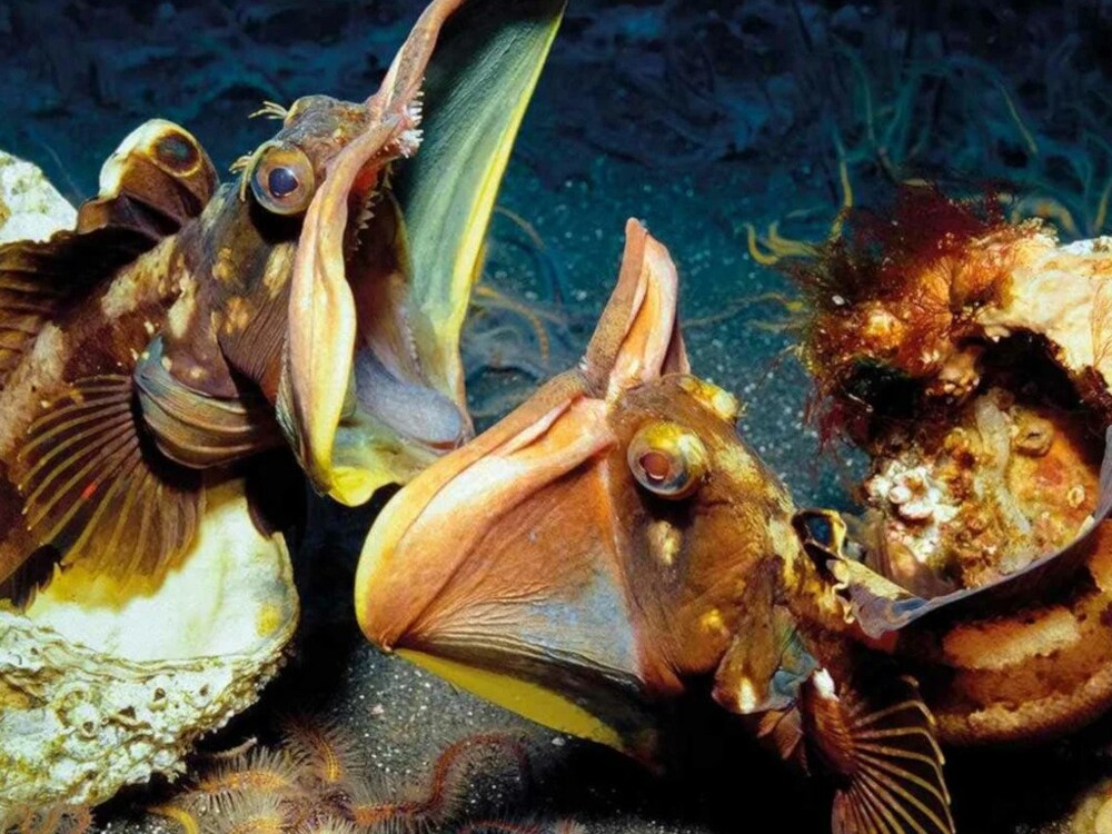 Щучий морський песик, він же Neoclinus blanchardi, він же Sarcastic fringehead. Останній переклад звучить особливо проникливо – саркастичний бахромоголів. Цю представницю загону окунеподібних не даремно шанобливо називають «кольоровим демоном». Собачка веде пустельницький спосіб життя, ховається в ущелинах підводних скель або залишилися без господарів раковинах.