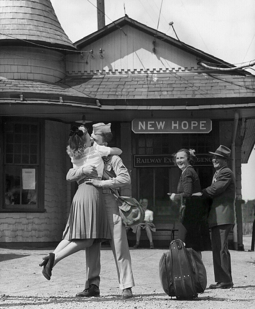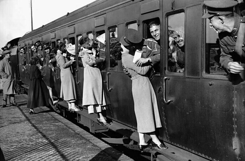 Солдат на ім'я Хекл цілує свою дівчину на прощання на залізничному вокзалі Лондона.