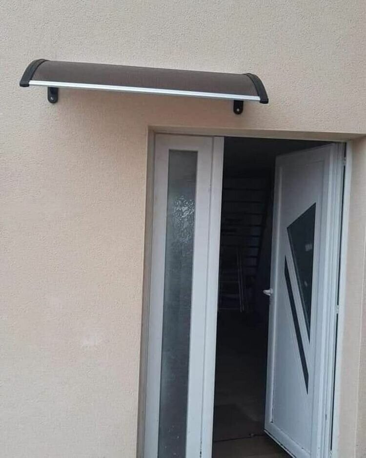Думаємо, навіс мав бути трохи правіше. Ну, або вхід лівіше.. Користувачі припустили, що цей навіс кріпив одноокий підрядник або в понеділок зранку, або в п'ятницю вдень ????