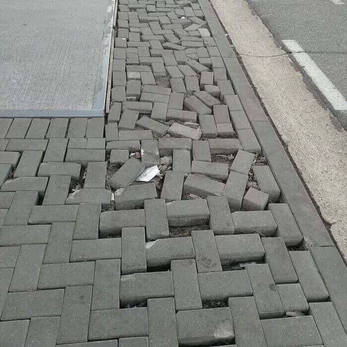 Виглядає так, ніби для цієї доріжки не вистачало бруківки, і начальство сказало: «Просто якось зроби з цього доріжку». Сподіваємось, що це просто тимчасове рішення. У будь-якому випадку ми не заздримо тому, хто тут спіткнеться ????