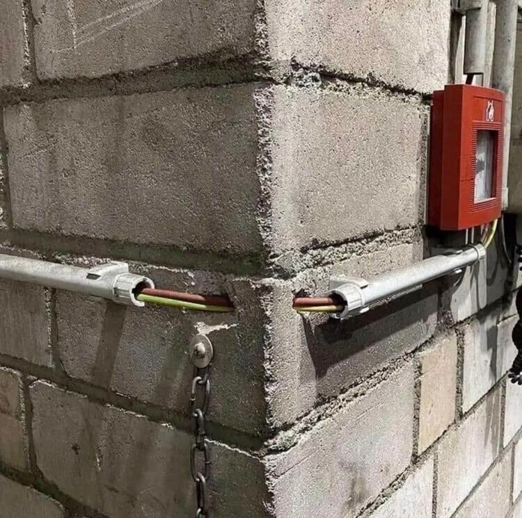 Користувачі висунули кілька версій: 1) у робітників був кабель обмеженої довжини; 2) робітники не довіряли пластиковим трубам на кутах і вирішили, що так кабель точно буде у безпеці; 3) у робітників були тільки прямі труби та кріплення для них, 4) судячи з ланцюга на фото, тут можуть зачинятися ворота. Насправді досить хитре рішення, яке можна взяти на замітку ⛏️