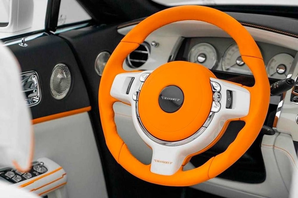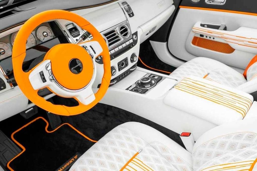 "Тема помаранчевого на білому продовжується в салоні, включаючи килимки, сидіння та рульове колесо, яке, що не дивно, виділяється сяючим цитрусовим кольором. Mansory не надала інформації про матеріали, що використовуються в салоні, але це будуть матеріали вищого якості."