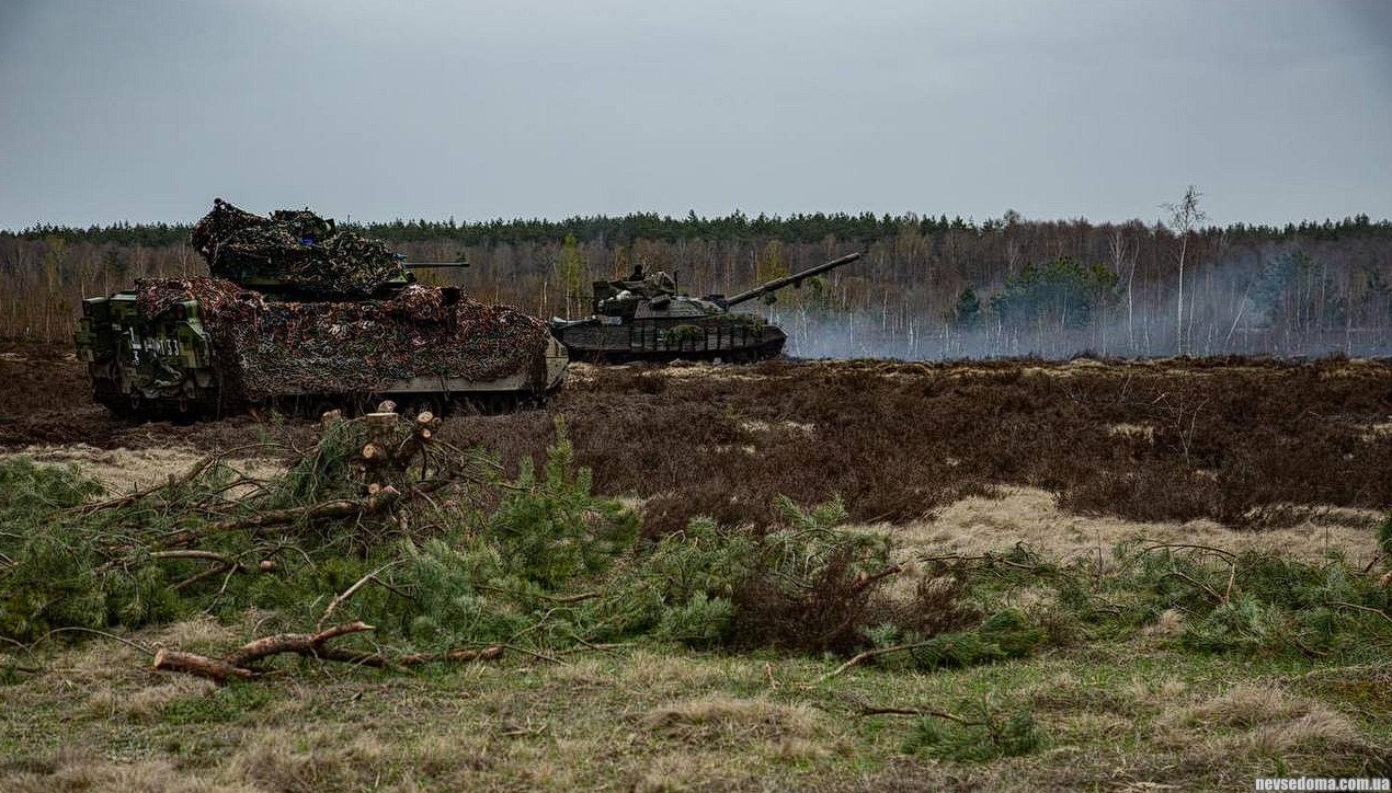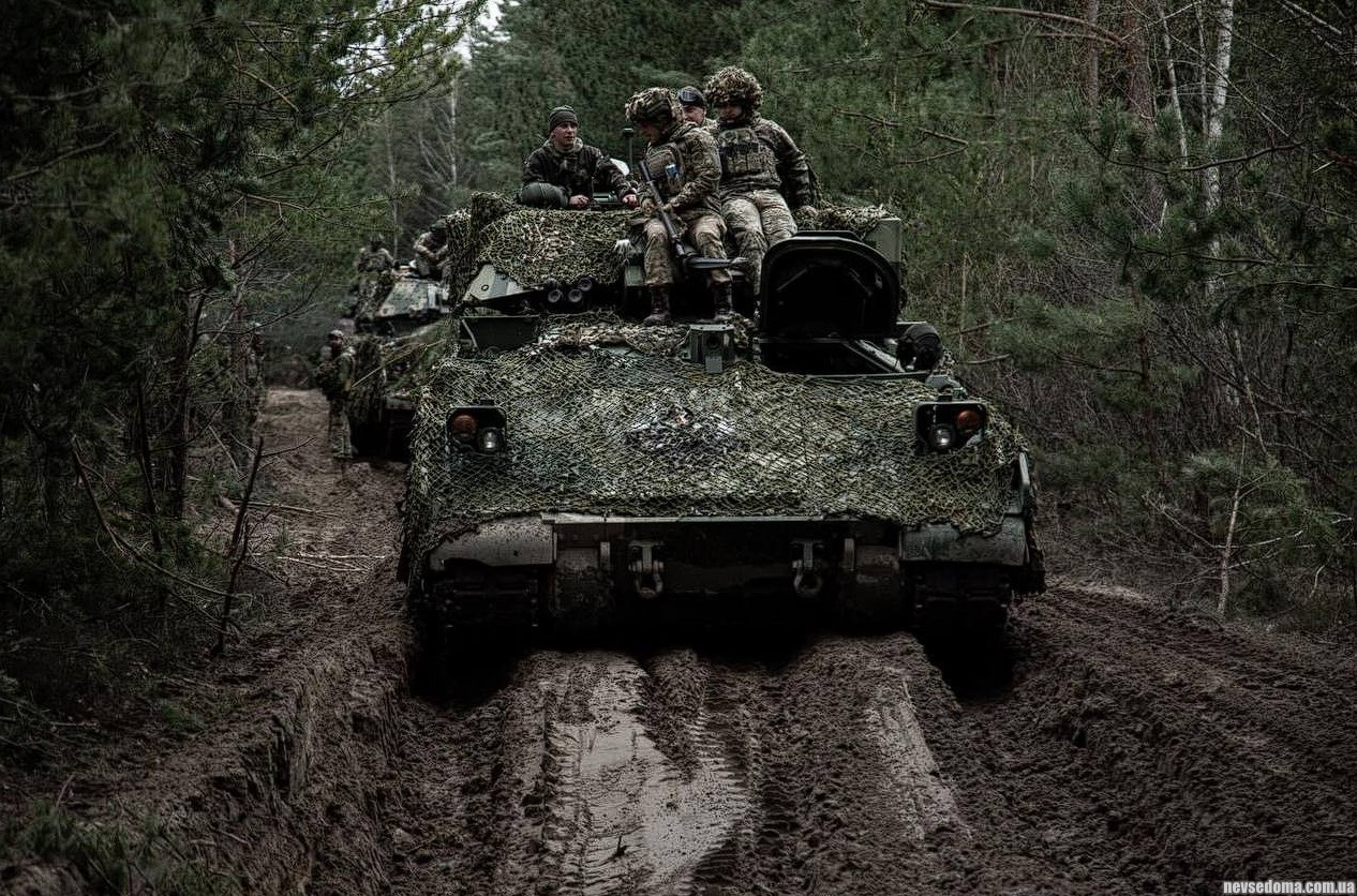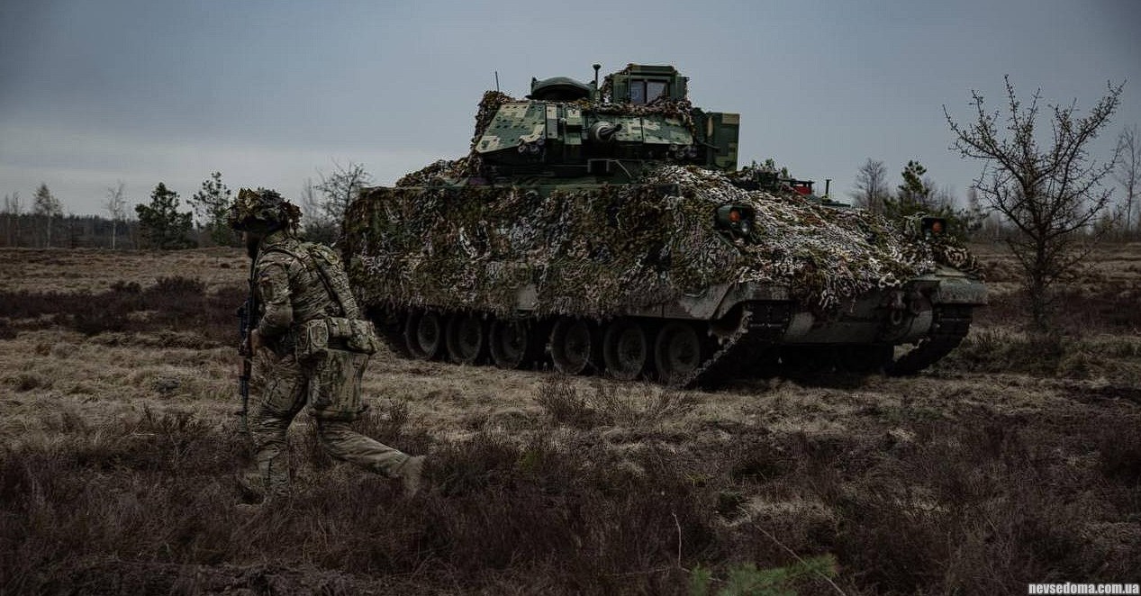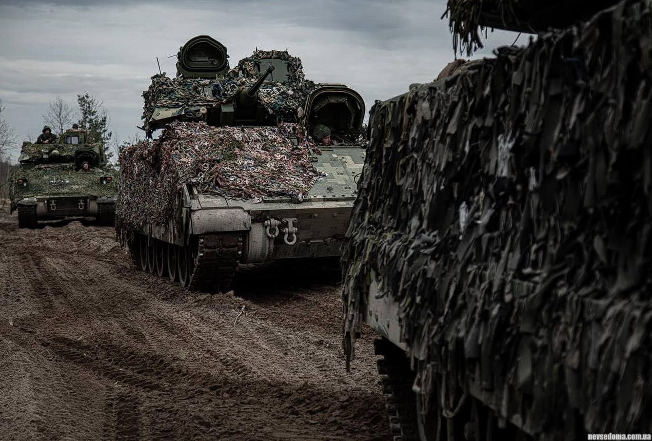 - Поставлені американцями українські БМП Bradley із новим піксельним камуфляжем разом із словенськими танками М-55С десь на полігоні в Україні.