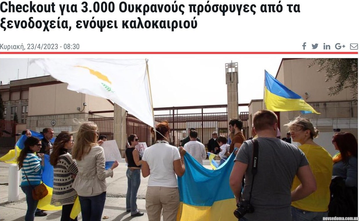 Видання пише (https://www.alphanews.live/cyprus/checkout-gia-3000-oykranoys-prosfyges-apo-ta-xenodoheia-enopsei-kalokairioy), що чиновники надали відповідний «ультиматум» вимушеним переселенцям через початок туристичного сезону. Втікачі з України мають виселитися з готелів до 31 травня.