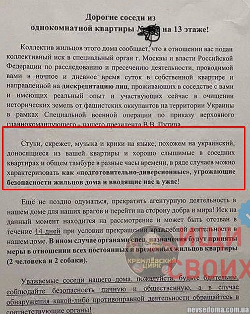 "Стуки, скрегіт, музика та крики мовою, схожою на українську, можна характеризувати як підготовчо-диверсійні, що загрожують безпеці мешканців будинку і вводять нас у жах"