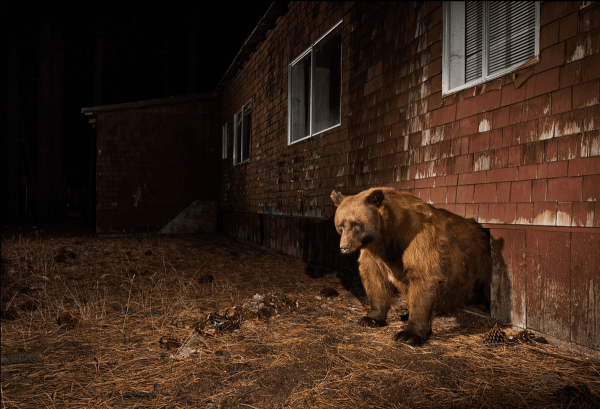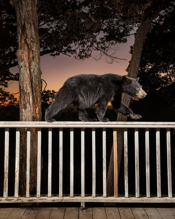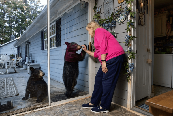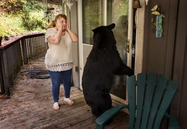 Жінка на фото купила будинок в Ешвіллі (Північна Кароліна), і кожен день трилапа мама-ведмедиця на ім'я Сара з'являлася на її ганку і дивилася через вікно. Незабаром ведмедиця та жінка потоваришували. Коли Корі приїхав фотографувати Сару, вона сама, своєю потужною лапою, відчинила двері й увійшла прямо до будинку.