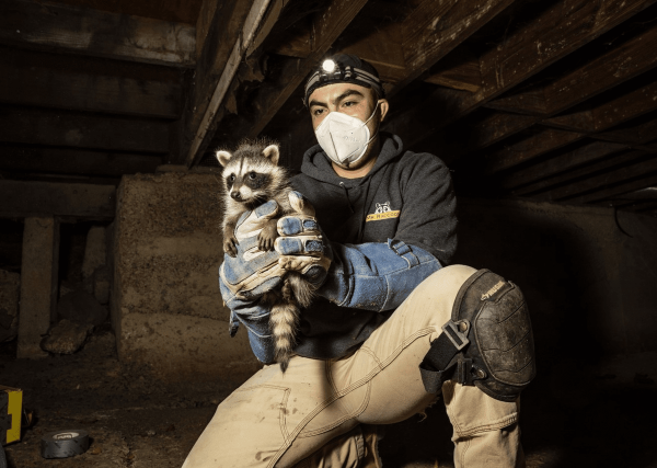 На фото працівник професійної служби з вилову єнотів. Вони ловлять єнотів, які без попиту оселилися на чужих горищах або в інших закутках будинку, і відпускають маленьких обурювачів спокою назад у дику місцевість.