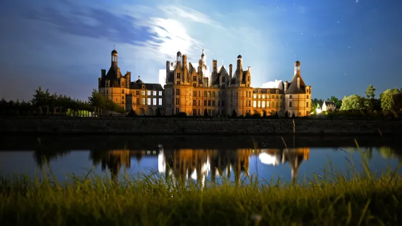 Немає кращого прикладу переходу від укріплених замків середньовіччя до розкішних будинків епохи Відродження, ніж цей величезний замок у долині Луари. Будівництво величезної споруди (440 кімнат) було розпочато на замовлення короля Франциска I на початку 16 століття (він захотів собі такий «мисливський будиночок») і тривало 28 років. Однак рів, кутові башти та фортеця носять чисто декоративний характер.