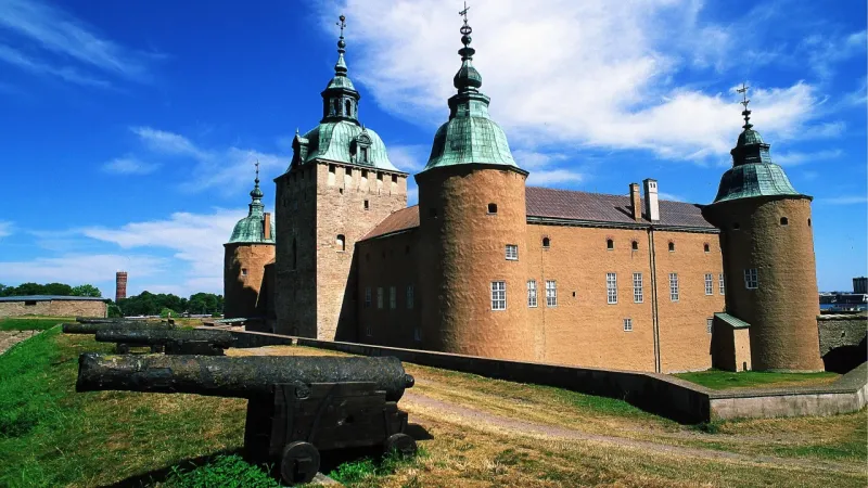 Замок Кальмар, заснований останніми роками епохи вікінгів, починався з оборонної вежі XII століття, що височіє над Кальмарським. протокою на Балтійському морі. Через чотири століття король Густав і його сини перетворили Кальмар на чудову королівську резиденцію, яка (завдяки реконструкції) сьогодні виглядає майже так само, як і в 1592 року.