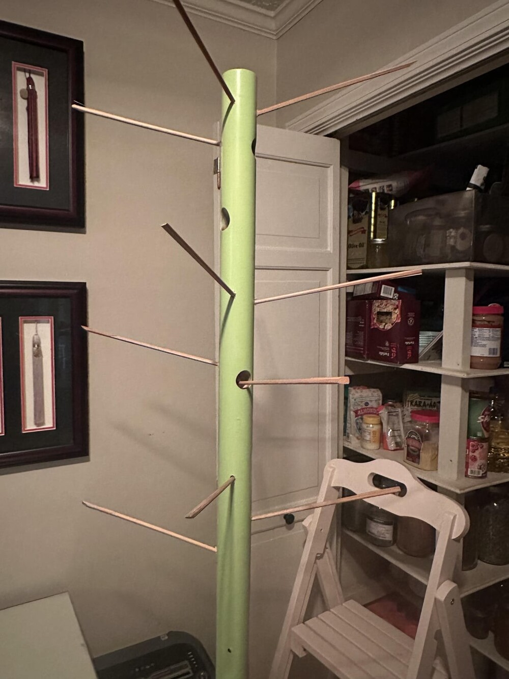 13. Я зробив сушарку для пасти зі старої вішалки та паличок для їжі, і тепер мій собака не може їх дістати
