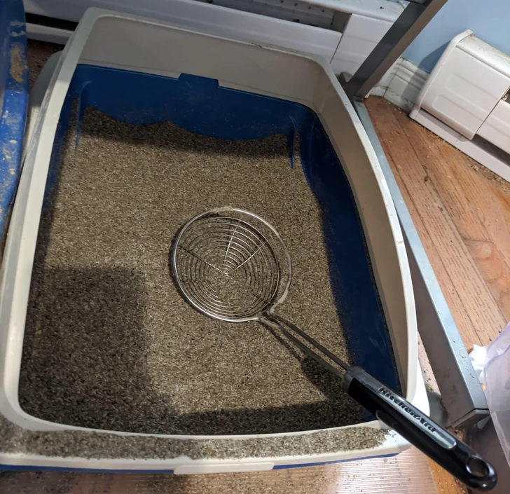 10. Пластикова лопата для котячого туалету зламалася. Потім я згадав, що в мене є кухонний друшляк